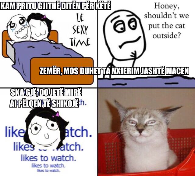 Ajo kërkon që të mbajë macen në dhomë. Shprehja e çuditshme në fytyrën e maces tregon çdo gjë