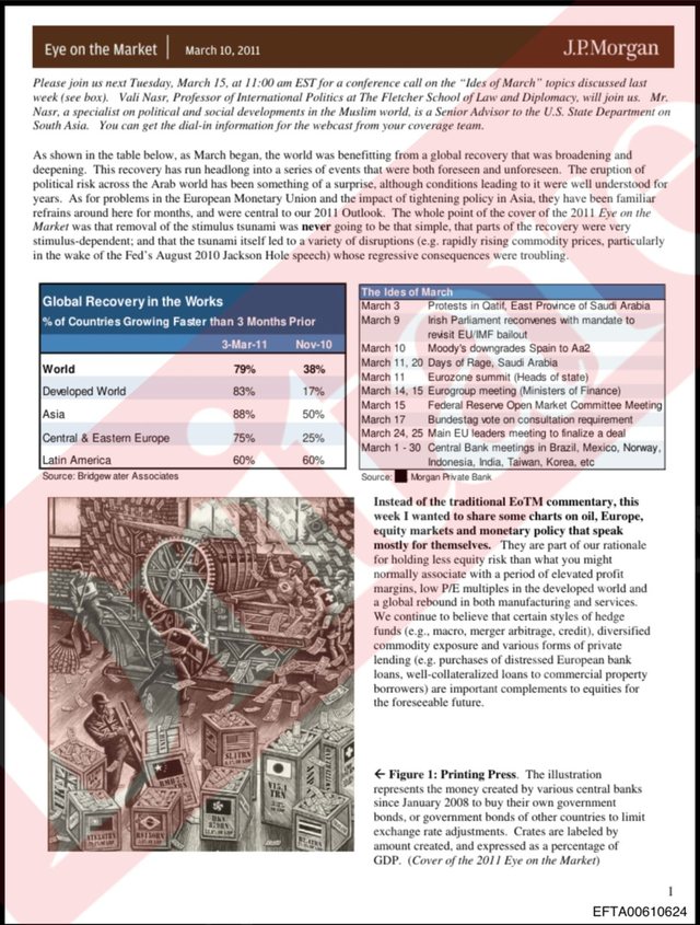 Dokumenti në fjalë është një analizë e titulluar “Eye on the Market”, e përgatitur më 10 mars 2011 nga banka investuese J.P. Morgan. Ai është përfshirë në dosjen Epstein si material i sekuestruar, jo si provë penale apo dokument hetimor.