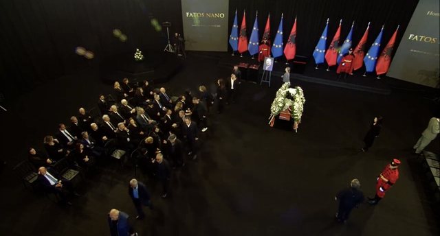 Në Pallatin e Kongreseve ka mbërritur arkëmorti me trupin e pajetë të liderit historik të PS, Fatos Nano. Të pranishëm familjarë të Fatos Nanos, mes tyre bashkëshortja e tij, Xhoana Nano, djali Sokoli dhe ish-bashkëshortja Rexhina. Homazhet publike kanë nisur që prej orës 8:30. Më pas nga ora 11:15-11:45 do të zhvillohen homazhet e personaliteteve shtetërore dhe të trupit diplomatik.