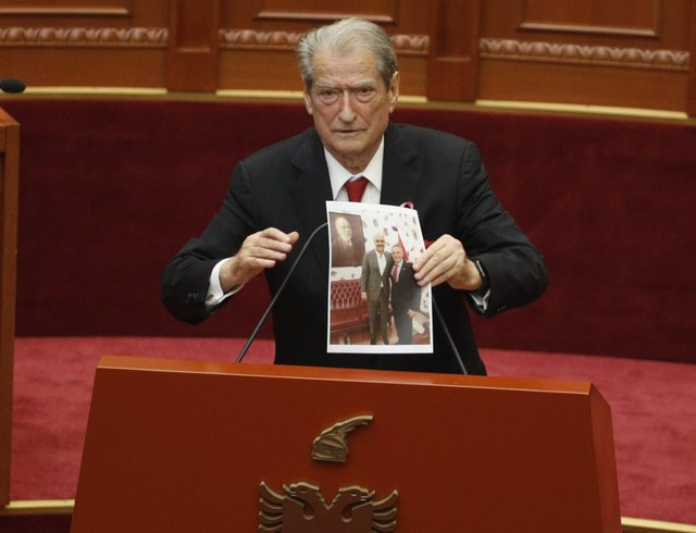 Berisha e mori foton dhe e vendosi pranë tij në foltore: “E vëmë këtu se mediat e duan. Keni frikë e tmerr nga mediat Skandal ndërkombëtar që bashkon në një kryezbuluesin e FBI-së, MC Gonigal, Edi Ramën, ministra të tij e zyrtarë, gjykatës e prokurorë dhe dimensionet e këtij skandali janë ende të papërcaktuara” tha Berisha./dritare.net