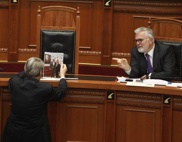 Fotoja u vendos tek karrigia bosh e Ramës, ndërsa ministri Toni Gogu replikoi me Berishën duke i thënë se nuk lejohen postera në Kuvend.