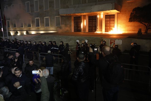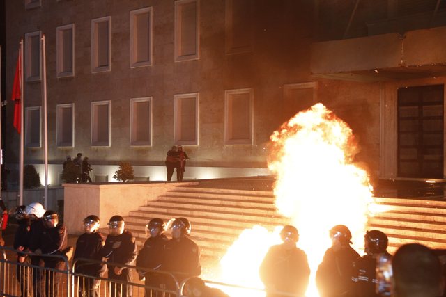 Pas përfundimit të fjalimit, situata u tensionua. Disa protestues hodhën bomba molotov drejt kordonit të policisë dhe hyrjes së Kryeministrisë, por flakët u shuan shpejt. Gjatë kaosit, një protestues u përfshi nga flakët pasi një molotov i shpërtheu në këmbë, duke shkaktuar panik mes turmës.