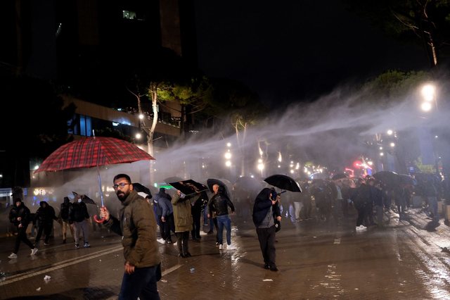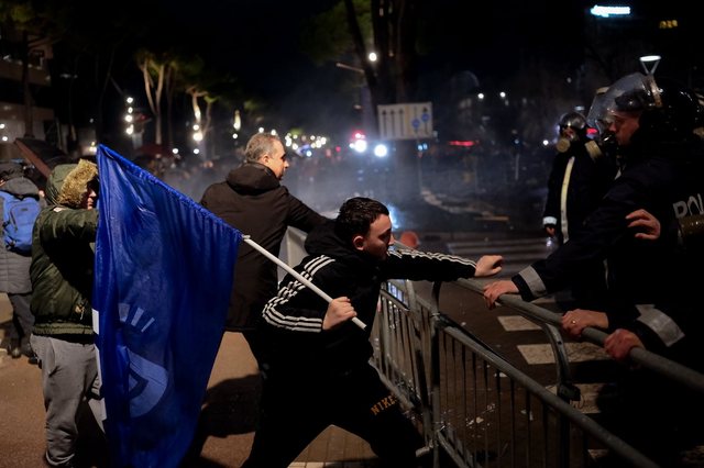Policia ndërhyri me ujë për shpërndarjen e turmës, duke parandaluar përplasje më të rënda, ndërsa disa protestues tentuan të thyejnë kordonin e sigurisë.