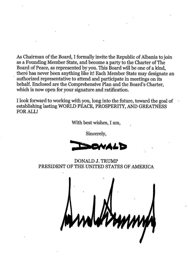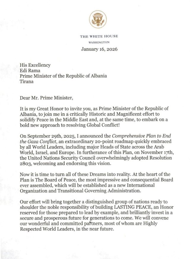 Kryeministri Edi Rama ka publikuar sot në Facebook një letër që ka marrë nga Presidenti i Shteteve të Bashkuara, Donald J. Trump, ku ky i fundit e fton Shqipërinë të bëhet shtet anëtar themelues i një organizmi të ri ndërkombëtar, të quajtur “Bordi i Paqes”.