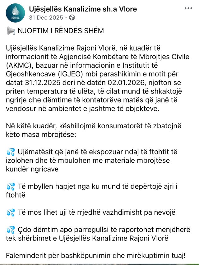 UKT Vlorë lajmëron se i vodhën saraçineskën! Ndërprerje në disa zona